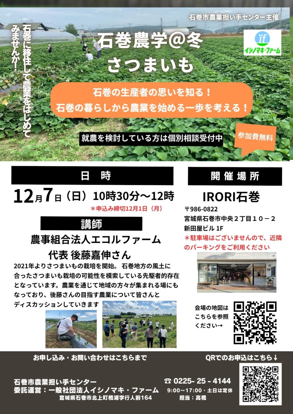 東京都西東京市出身。2017年石巻でREBORN ART FESTIBALをきっかけに初来石。その時に北上川沿いの景色に圧倒される。東京で生活していたが、家族の時間を優先に考えるようになり、2019年に石巻の北上町に夫婦で移住。農業を学びながらも、自然や温かい人たちに守られながら1匹の犬と夫婦ゆるりと生活しています。石巻弁の通訳募集しています。(笑)